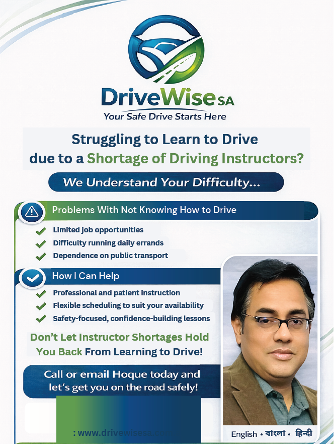 ল কর্মজীবন গড়ে তুলেছি, যেখানে আমার ১৪ বছরেরও বেশি বাস্তব ড্রাইভিং অভিজ্ঞতা রয়েছে। এই সময়ে আমি অস্ট্রেলিয়ার ড্রাইভিং মানদণ্ড, সড়ক নিরাপত্তা বিধি এবং একজন চালকের দায়িত্ব সম্পর্কে গভীর ধারণা অর্জন করেছি। পাশাপাশি, আমি ব্যক্তিগতভাবে আমার স্ত্রী ও ছেলেকে প্রশিক্ষণ দিয়েছি, এবং তারা উভয়েই সফলভাবে দক্ষিণ অস্ট্রেলিয়ার ড্রাইভিং লাইসেন্স অর্জন করেছে। এতে আমার নিরাপদ ড্রাইভিং শেখানোর প্রতি আগ্রহ আরও বৃদ্ধি পেয়েছে।