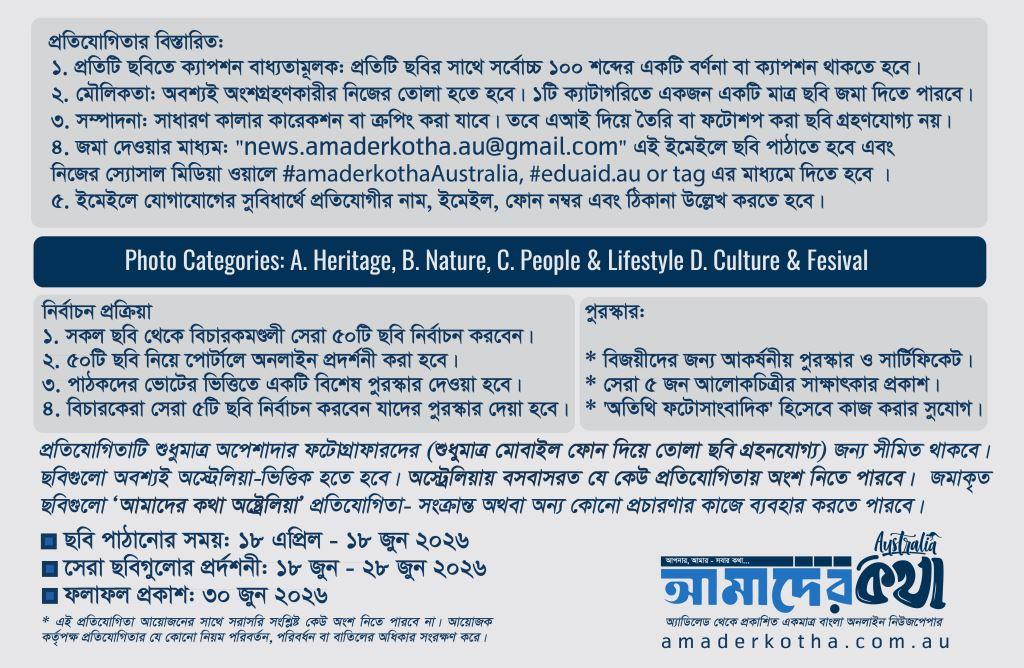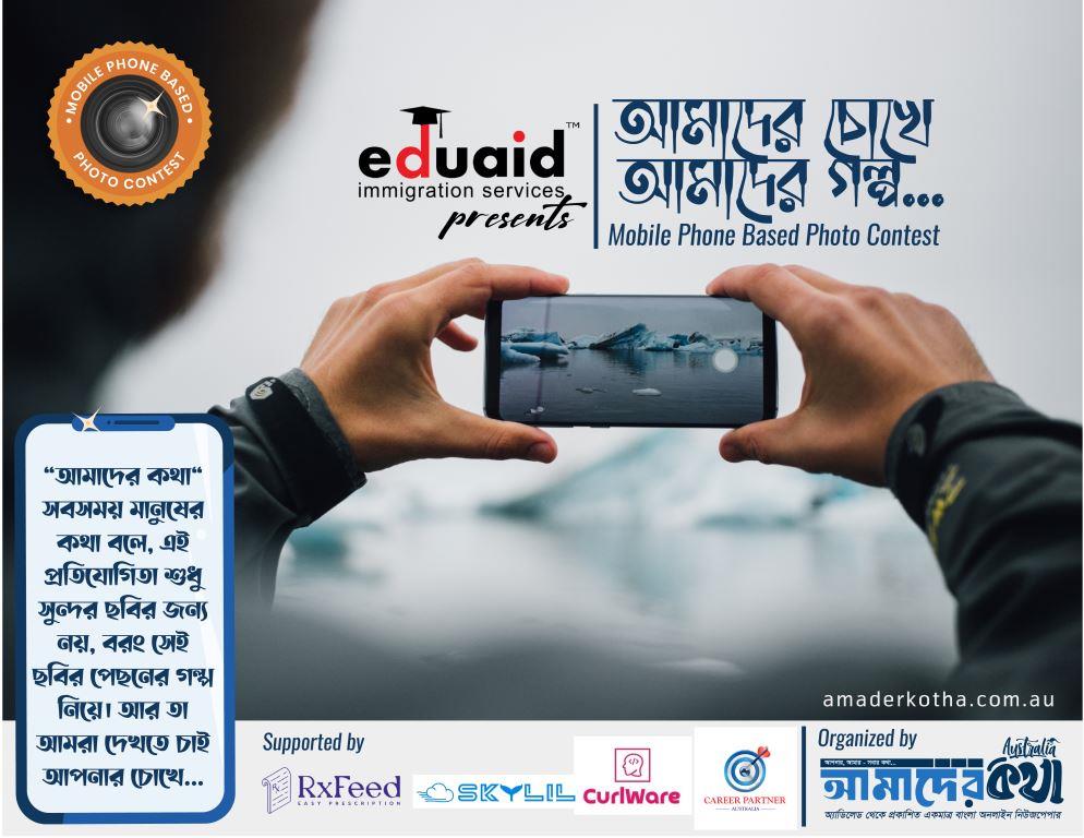 অস্ট্রেলিয়ার মাটিতে প্রবাসী বাঙালিদের জীবনগাথা, ঐতিহ্য আর প্রকৃতির অদেখা রূপ লেন্সবন্দি করতে এক ব্যতিক্রমী আয়োজন নিয়ে ‘আমাদের কথা অষ্ট্রেলিয়া’র ব্যবস্থাপনায় শুরু হয়েছে মোবাইল ফোনে তোলা আলোকচিত্র প্রতিযোগিতা— Eduaid presents ‘আমাদের চোখে আমাদের গল্প’। Eduaid (এডিউএইড) মূলত একটি আন্তর্জাতিক শিক্ষা ও অভিবাসন পরামর্শক প্রতিষ্ঠান (Education and Migration Consultancy), যা দীর্ঘ দুই দশকেরও বেশি সময় ধরে বিশ্বজুড়ে শিক্ষার্থীদের উচ্চশিক্ষা এবং পেশাদারদের অভিবাসন প্রক্রিয়ায় সহযোগিতা করে আসছে। তারা সামাজিক দায়বদ্ধতা এবং সৃজনশীল বিকাশের অংশ হিসেবে আমাদের কথা অষ্ট্রেলিয়ার সাথে যুক্ত হয়ে এই আলোকচিত্র প্রতিযোগিতার আয়োজন করেছে।